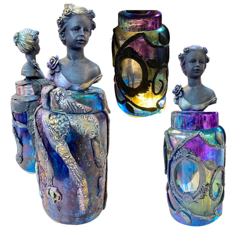 Lampion szklany popiersie – (25×13 cm) mixmediowa przestrzenna kompozycja na szkle z efektem lustra, nauka cieniowania woskami i pigmentami metalicznymi